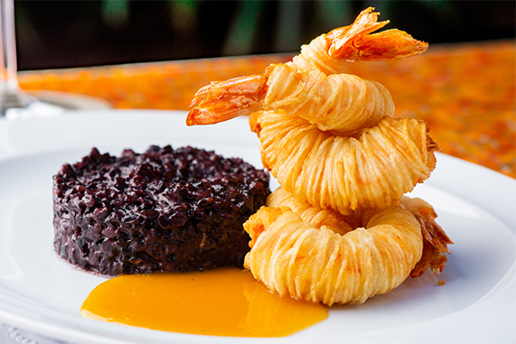 Camarão crocante com risotto ruzene ao molho de tucupi