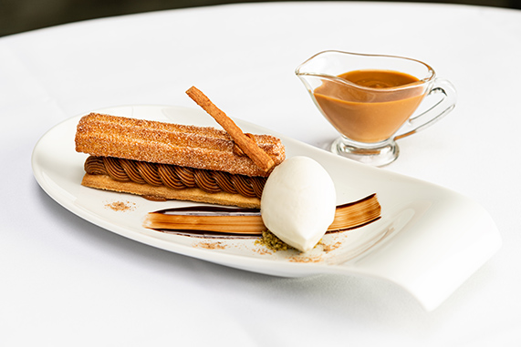 Churros com pâte sablée, calda de doce de leite e sorvete de baunilha