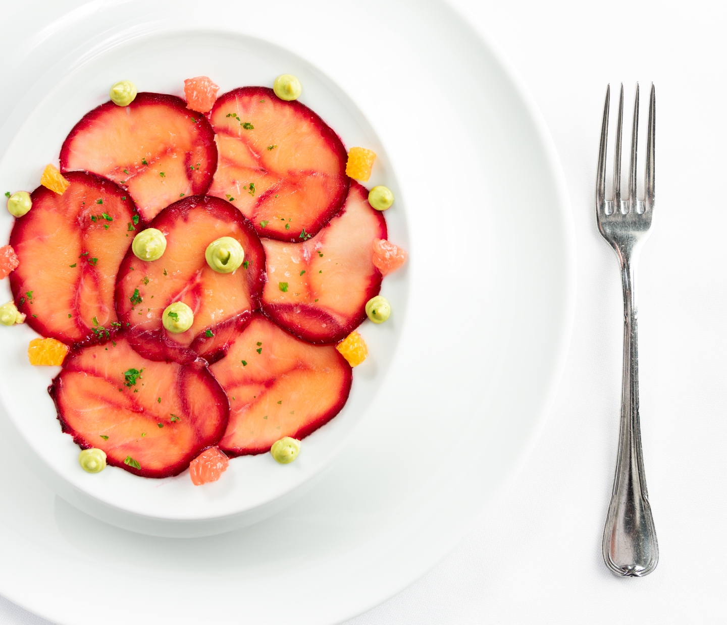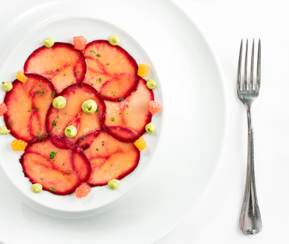 Loin of Lamb carpaccio with arugula bouquet and capes vinaigrette - Carpaccio de salmão rouge com creme de avocado